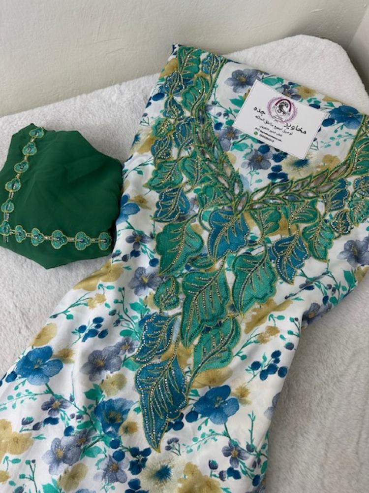 حرير اندنوسي بالطرحه تطريز وكريستال صدر واكمام مخرم صدر واكمام